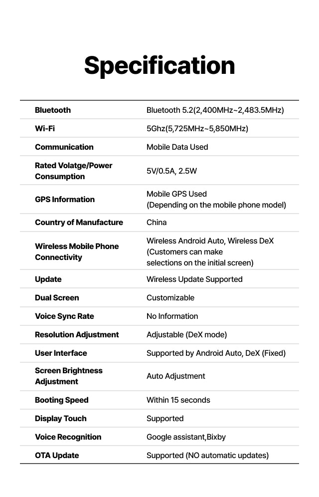 - Автоматичне підключення + бездротовий Android Auto та Samsung DEX;- Безкоштовний додаток-компаньйон;- Підтримка вертикального дисплея для версії ONE UI 8- Спеціальний режим розділеного дисплея дозволяє закріпити 2 улюблені додатки поруч;- Швидкість підключення: до 15 сек;- Стабільність підключення та швидка передача даних без затримки;- Якість відтворення відео та аудіо;- Підтримка гучного зв'язку при дзвінках;- Повний функціонал телефону на дисплеї авто!