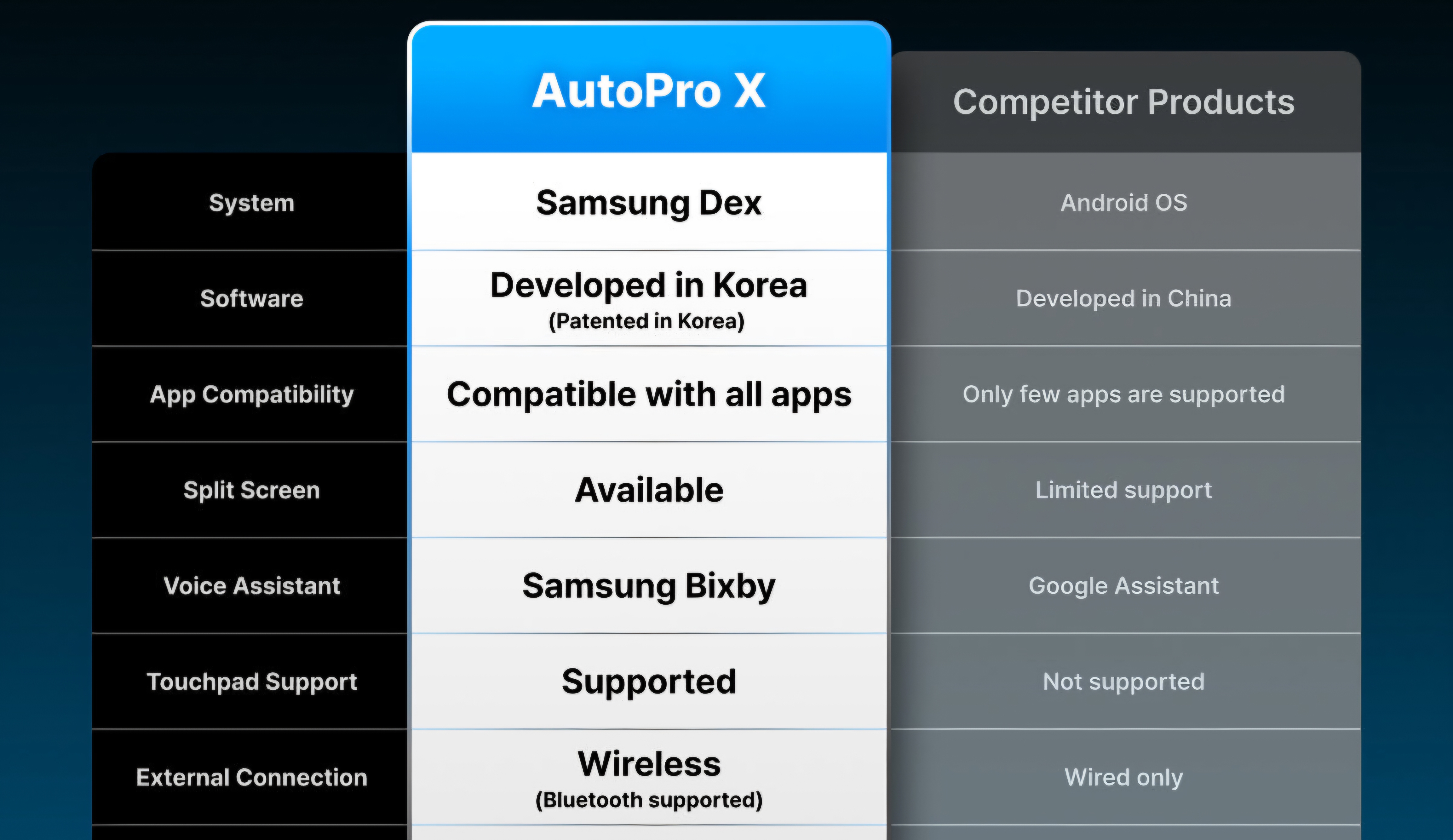 AutoPro X це унікальний девайс, що поєднує в собі класичний бездротовий Android Auto і спеціально для користувачів смартфонів Samsung серії S, будь якої моделі серії FOLD та NOTE можливості використання Samsung DEX прямо на екрані автомобіля, що перетворює його на повноцінний планшет!Це універсальний пристрій, що забезпечує бездротове користування Android Auto з будь яким телефоном, що підтримує цю функцію, а також операційної системи Samsung DEX одночасно з одного адаптера.